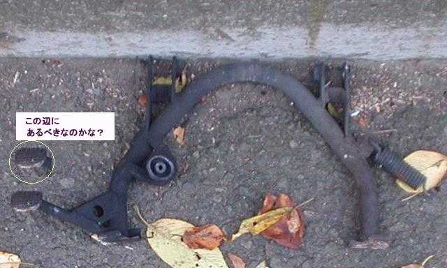 | センタースタンドが曲がってる............ というか、センターをかけると車体が右に傾く。 走ってる間に何度か縁石にぶっつけたからだが........ スタンドの足で踏むレバーが横に張り出しているのだが、走行時、スタンドを上げた状態でぶつけて後ろ方向に曲がったから、スタンドをかけた状態で下に曲がっている。 そこ(ピンク矢印)がスタンドの足(黄矢印)よりも先に地面に着くので、車体が傾いてしまうのだ。 |