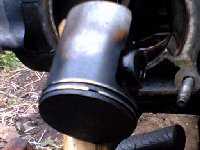 | さて、後かたづけを始める。 お宝になるはずのシリンダーヘッドとシリンダーをはずす。 ヘッドはハンマーで叩くととれた。シリンダーはなかなかとれない。お約束でスタッドの1本のところがなかなか抜けない。1時間近く格闘してやっと抜けた。 で、ピストンとご対面......... あのぉ〜 なんか黒くない?? |