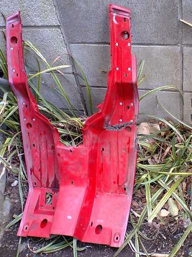 | いつものことだが、本体が死んでいる間に余計なことをやっている。 エンジンまで降ろすのにステップボードをはずしたら、補修した部分をまた割った。 |