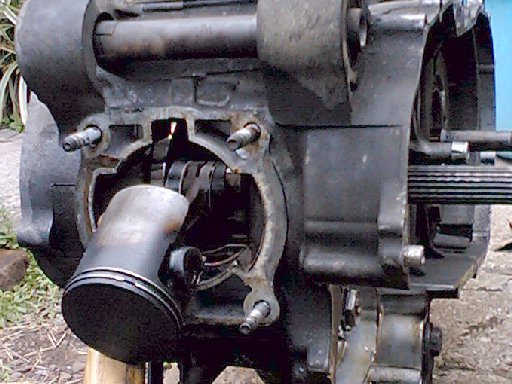 | 今回は、壊れた元祖ボロから泥だらけの本家ボロへ換装したわけだが、本家ボロで使えたのはクランクケース。クランクケースと言っても、ヘッドからピストンまでの腰上を含んでクランクシャフトまで+ミッション一式+リアブレーキ。 つまりクランクケースからプーリー前後、ステータ、ロータ、ホイールとそのカバー類を除いたものが入れ替わっている。 |
