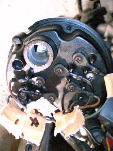 | あちこちガタがきている。 動かない燃料計の中古を物色しながら、ダメもとで分解してみる。 メーターケースには燃料計と水温計が同居していて6本の配線と証明ランプが来ているので、ラインに番号を振ってから配線をはずす。 はずすとなると、カウルはもちろん、燃料&水温計をはずすのにメーターパネルをはずす。メーターパネルをはずすためにライトハウジングまではずす。サイドパネル&ウィンカーからはじめてやっとたどり着く。 |